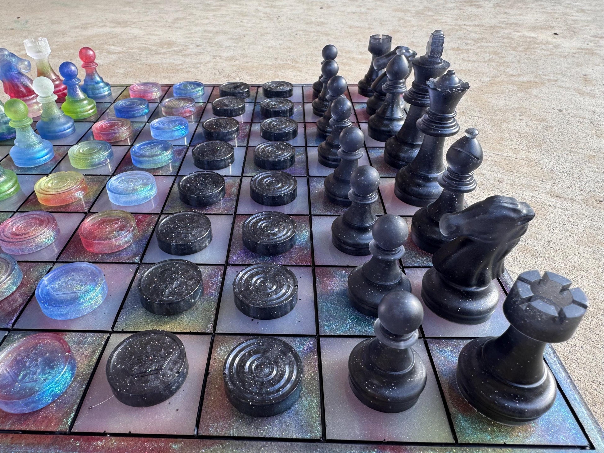 11 inch x 11 inch Gummy Jelly Candy Multichrome Colorful Epoxy Resin Chess/Checkers Board and Chess/Checkers Pieces